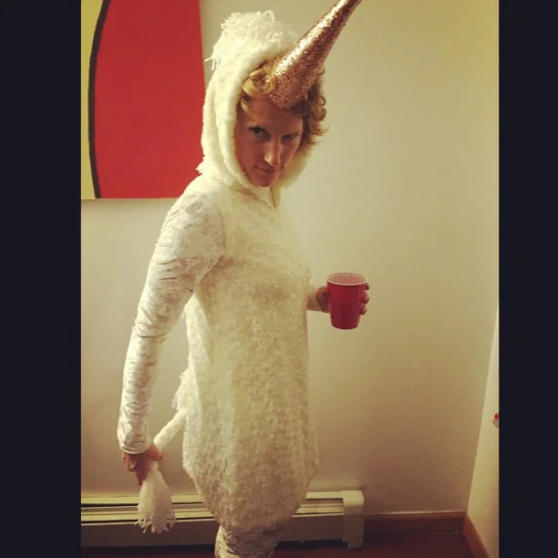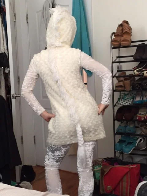 I have wanted to be a unicorn for Halloween for years and years. Finally, as Halloween came around this year I decided to go for it. I bought a white crushed velvet jumpsuit on etsy, some very soft fabric, white glitter yarn and some stiff glitter paper. I made a hooded dress out of the fabric, a horn out of the glitter paper horn, and wore black shoes and socks for hoofs.
